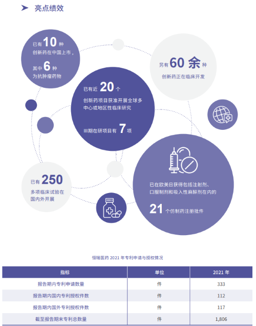 报告指出,在科技创新战略引领下,AG百家乐官网医药2021年累计研发投入62.03亿元,比上年增长24.34%,研发投入占销售收入比重达到23.95%,再创历史新高。以此为支撑,2021年公司有3款创新药获批上市,已上市创新药总量增至10款,其中6款为抗肿瘤药物。同时还有60余种创新药正在临床开发,250多项临床试验在国内外开展,其中近20个创新药项目获准开展全球多中心或地区性临床研究。在创新药研发上,AG百家乐官网医药已基本形成了上市一批、临床一批、开发一批的良性循环。